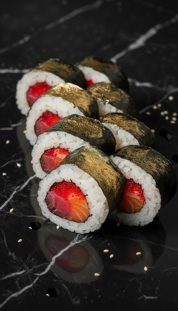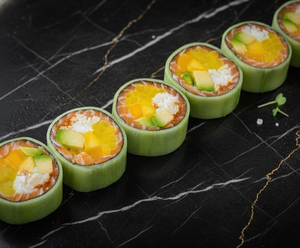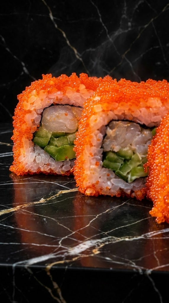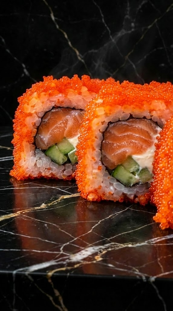 Роскошное сочетание нежного мяса камчатского краба и премиального лосося. Свежесть огурца и сливочного авокадо дополняется яркой сладостью спелого манго, а икра летучей рыбы добавляет изысканный хруст и морской акцент. Вкус, достойный особого случая
