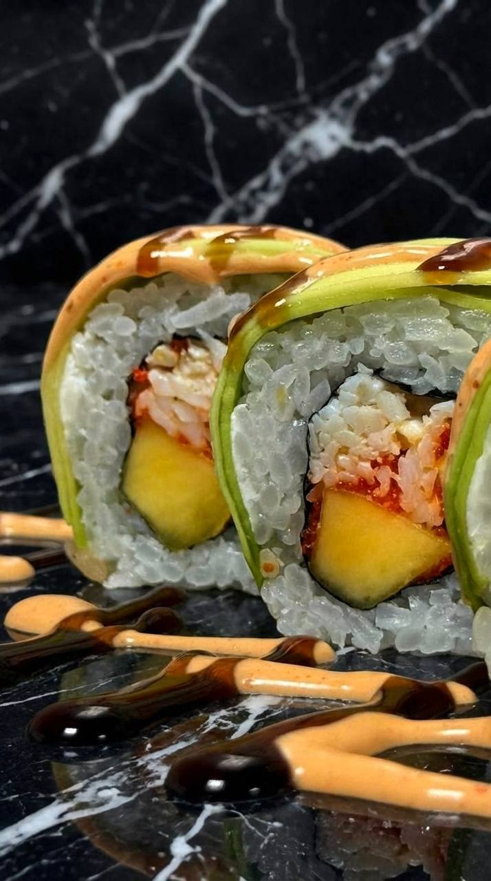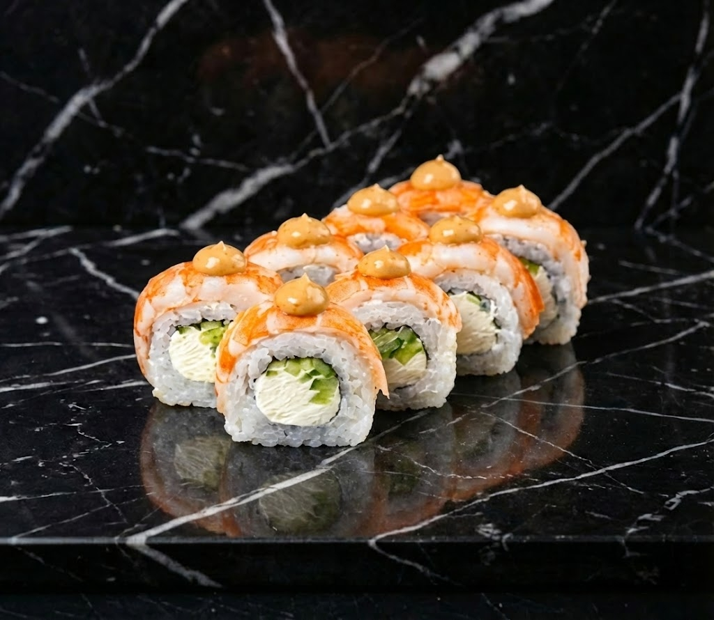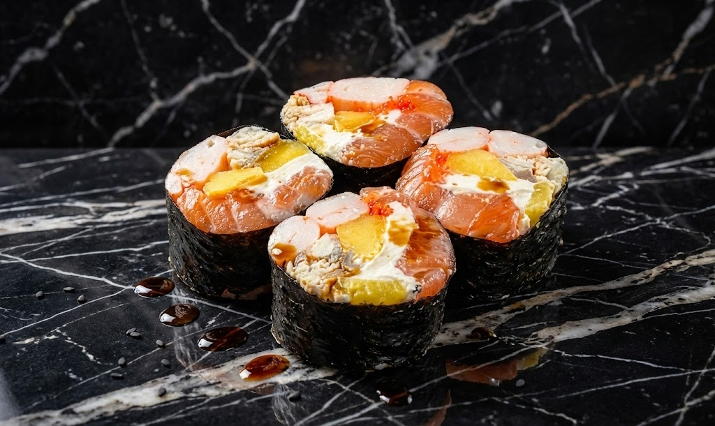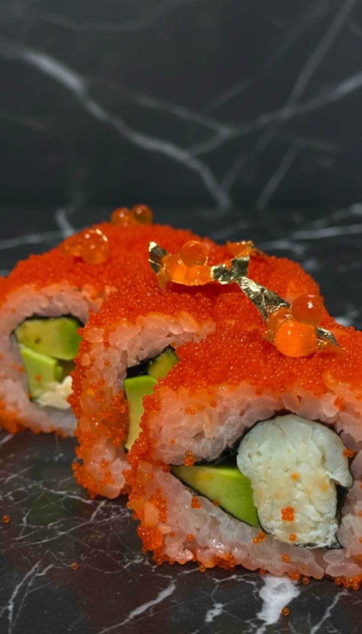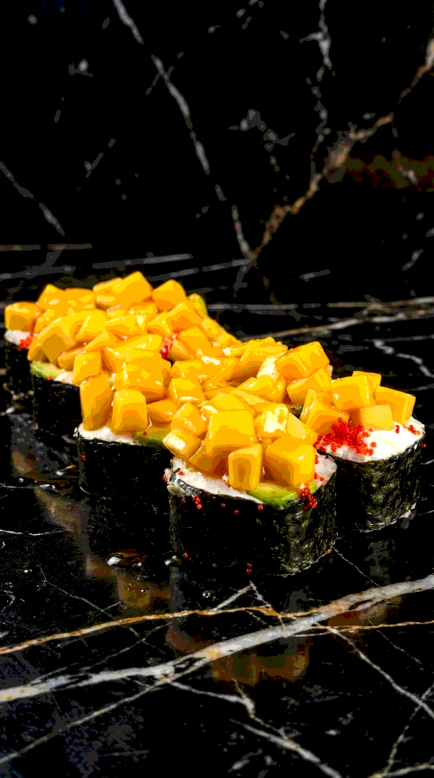 Гастрономическая роскошь в каждом кусочке. Нежный лосось и хрустящая тигровая креветка в объятиях сливочного сыра, дополненные свежестью авокадо и сладким тайским манго. Усыпано икрой масаго для идеального баланса