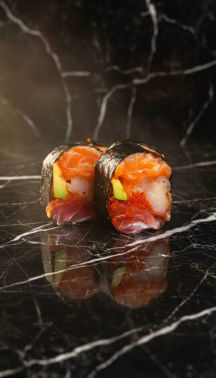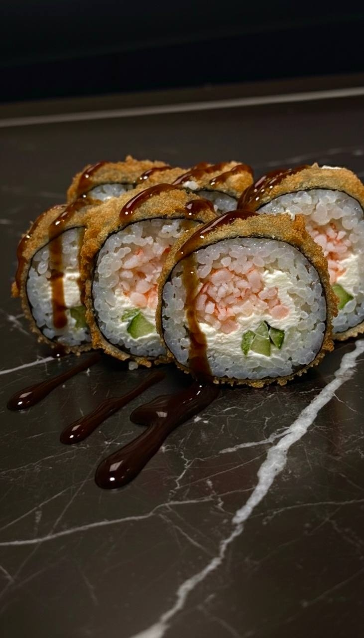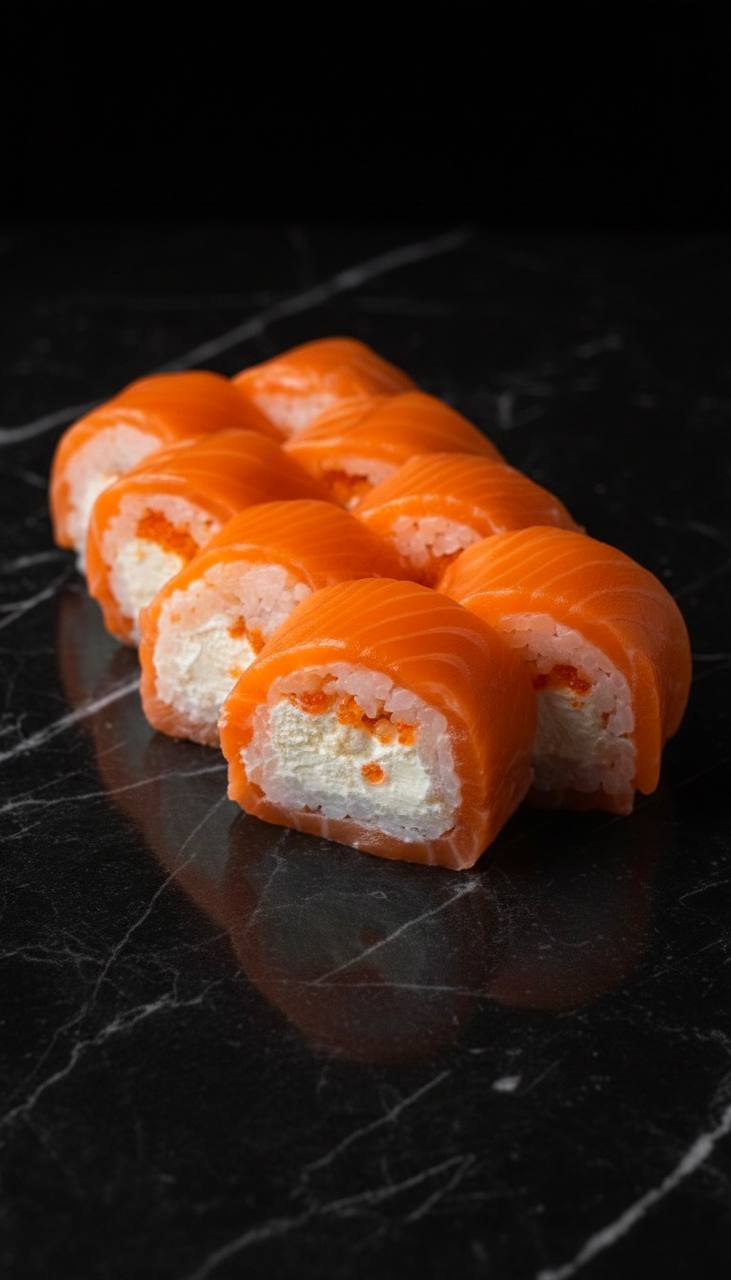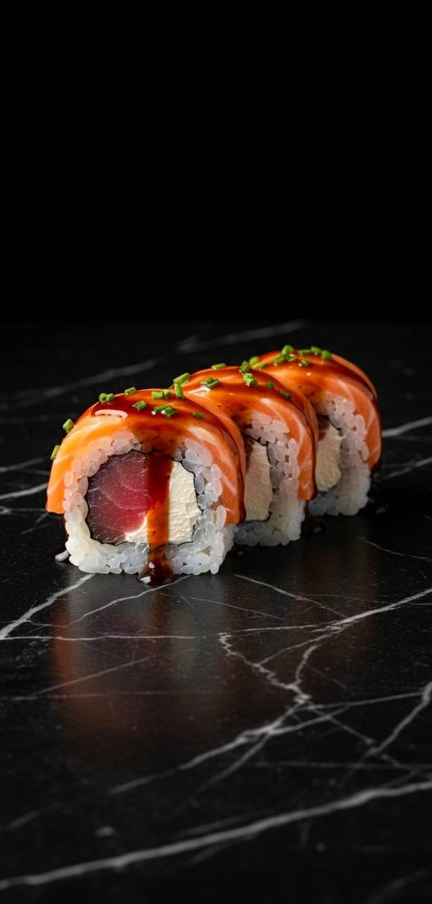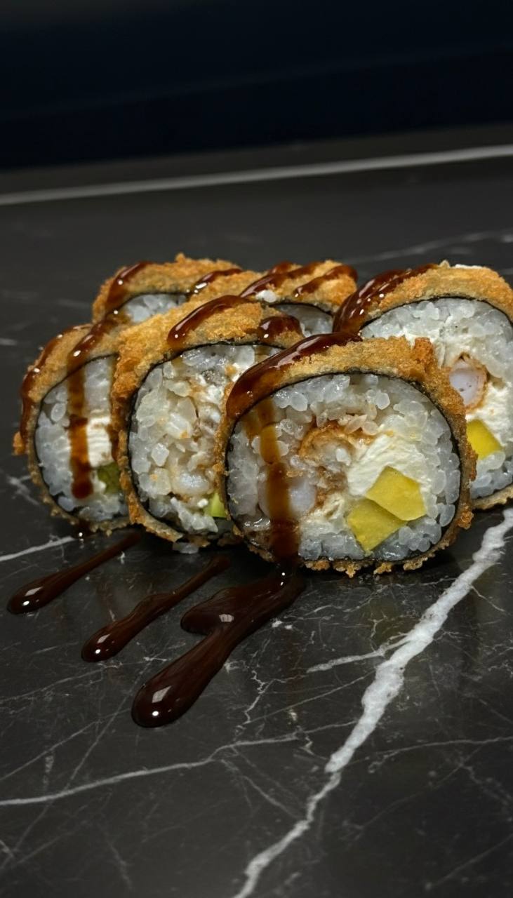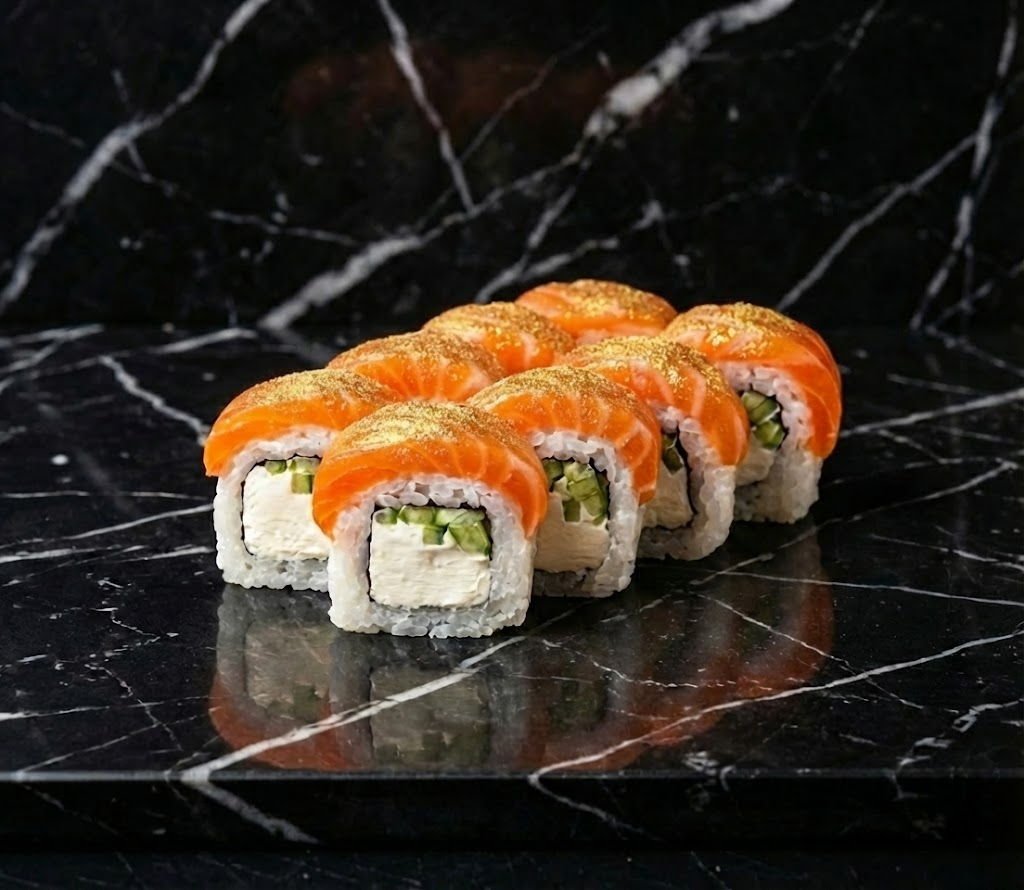 Гастрономическая роскошь в каждом кусочке. Нежный лосось и хрустящая тигровая креветка в объятиях сливочного сыра, дополненные свежестью авокадо и сладким тайским манго. Усыпано икрой масаго для идеального баланса