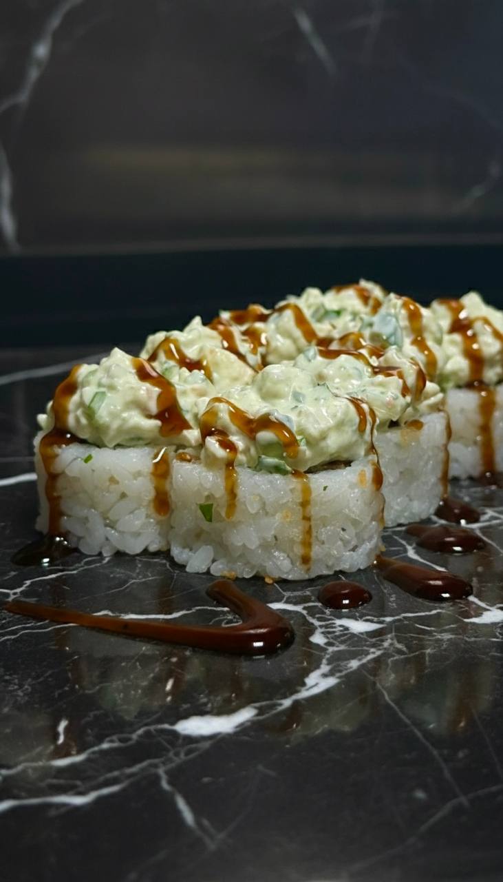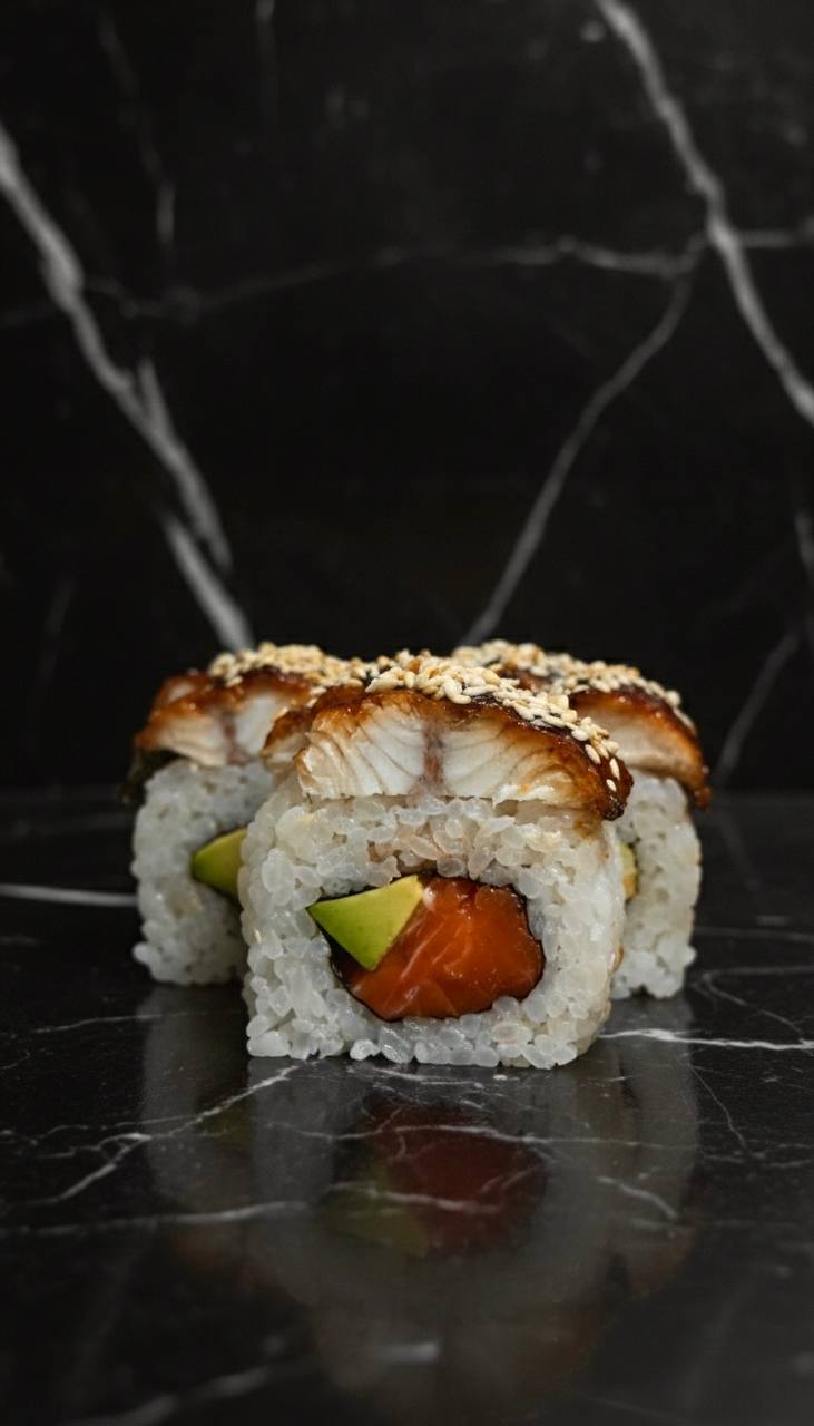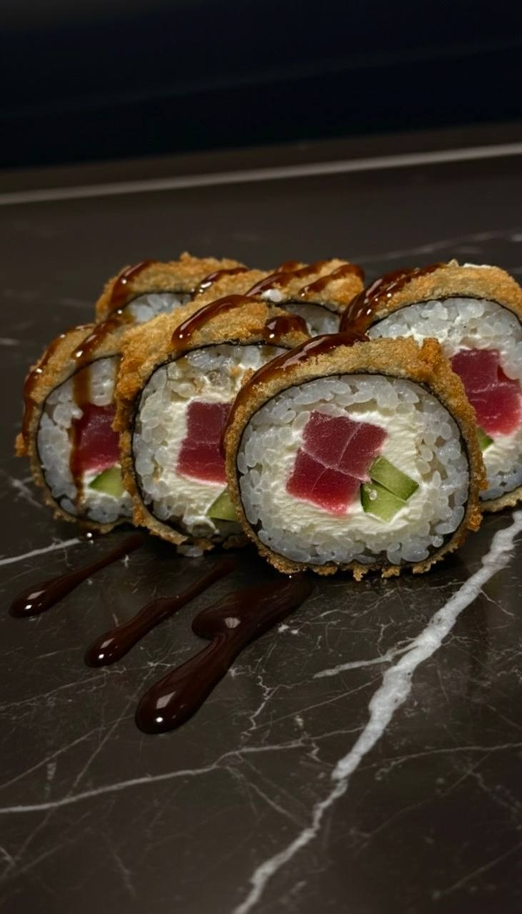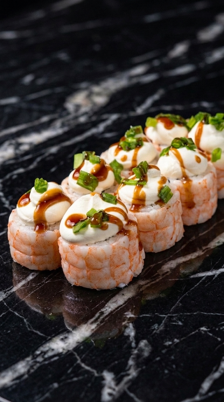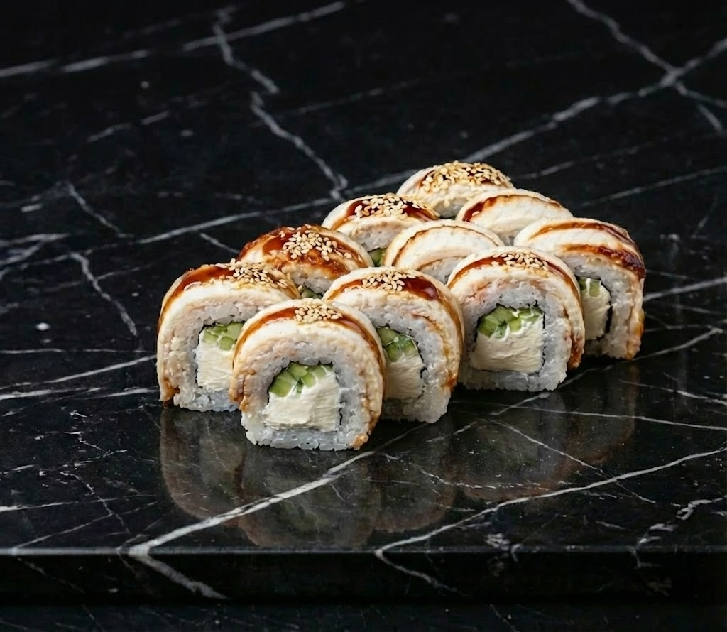 Гастрономическая роскошь в каждом кусочке. Нежный лосось и хрустящая тигровая креветка в объятиях сливочного сыра, дополненные свежестью авокадо и сладким тайским манго. Усыпано икрой масаго для идеального баланса