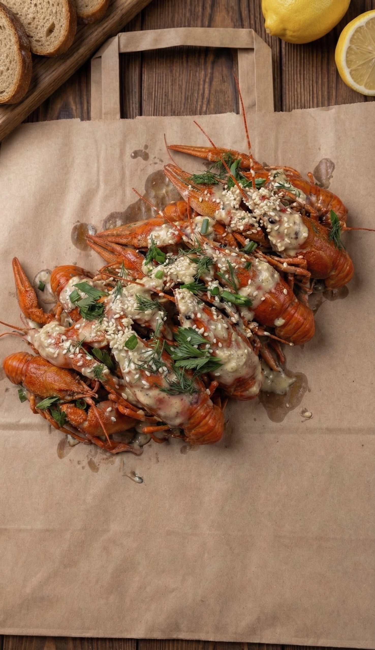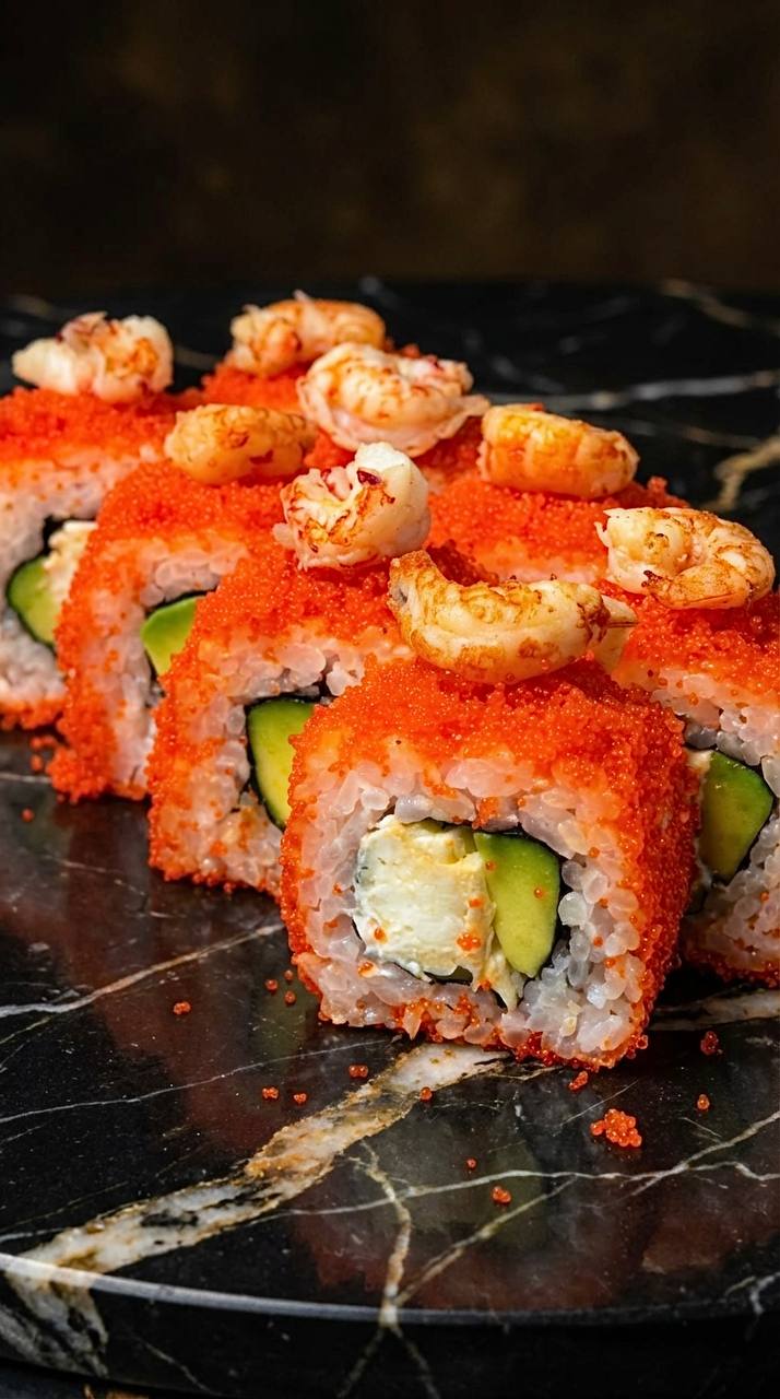 Креветка с авокадо и огурцом, щедро приправленный тобико и фирменным соусом. Шапка заправлена дополнительно креветкой. Яркий, сочный и современный ролл с яркой подачей вкуса.