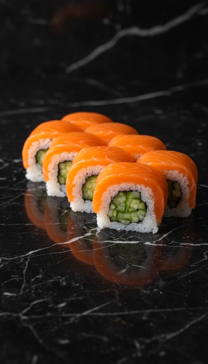 Лосось с авокадо и огурцом, щедро приправленный тобико и фирменным соусом. Шапка заправлена дополнительно лососем. Яркий, сочный и современный ролл с яркой подачей вкуса.