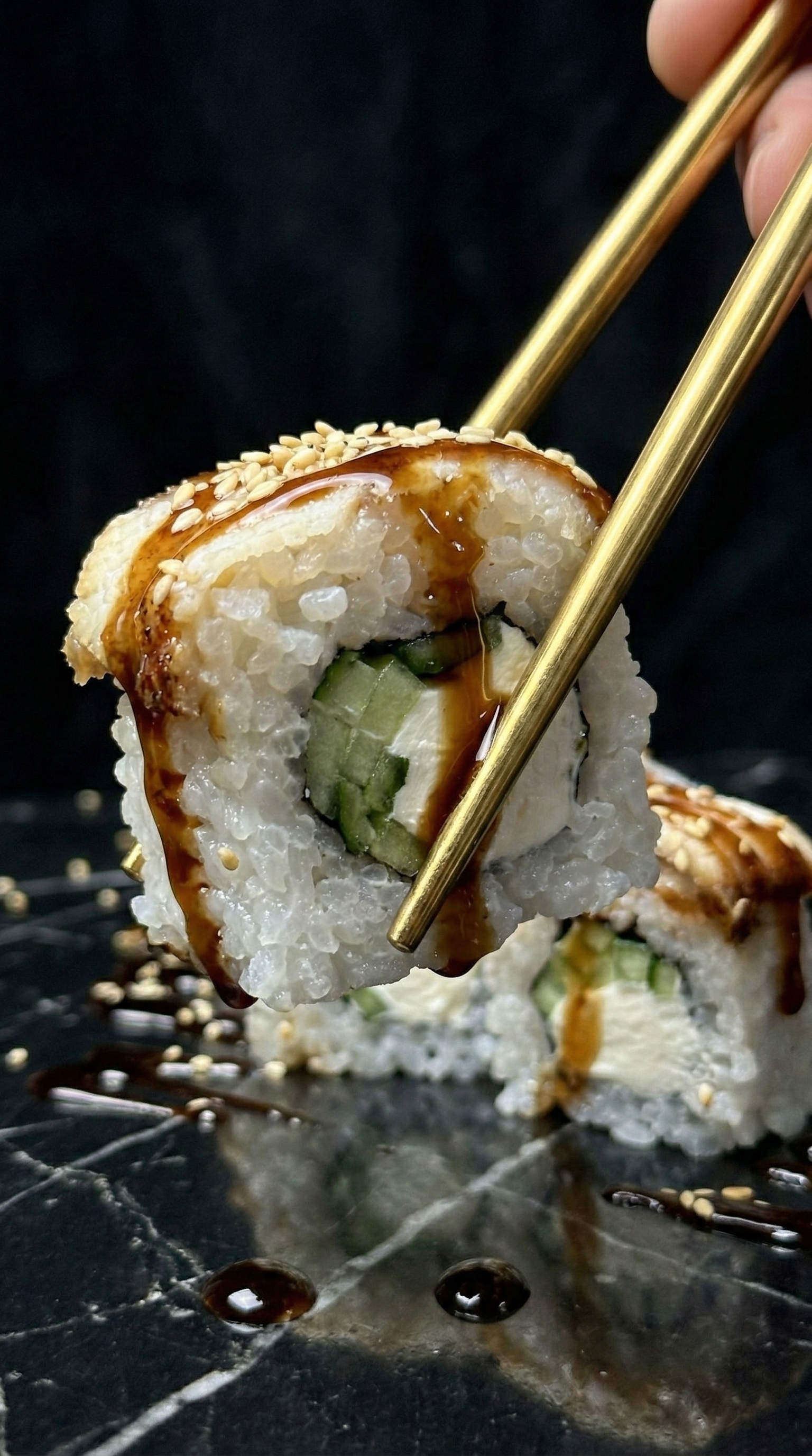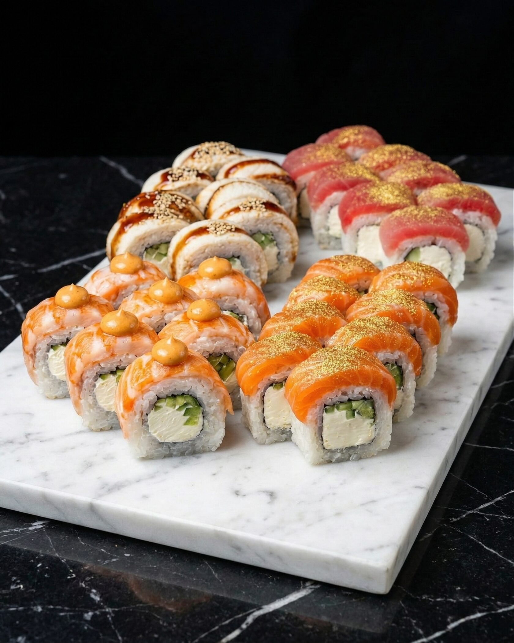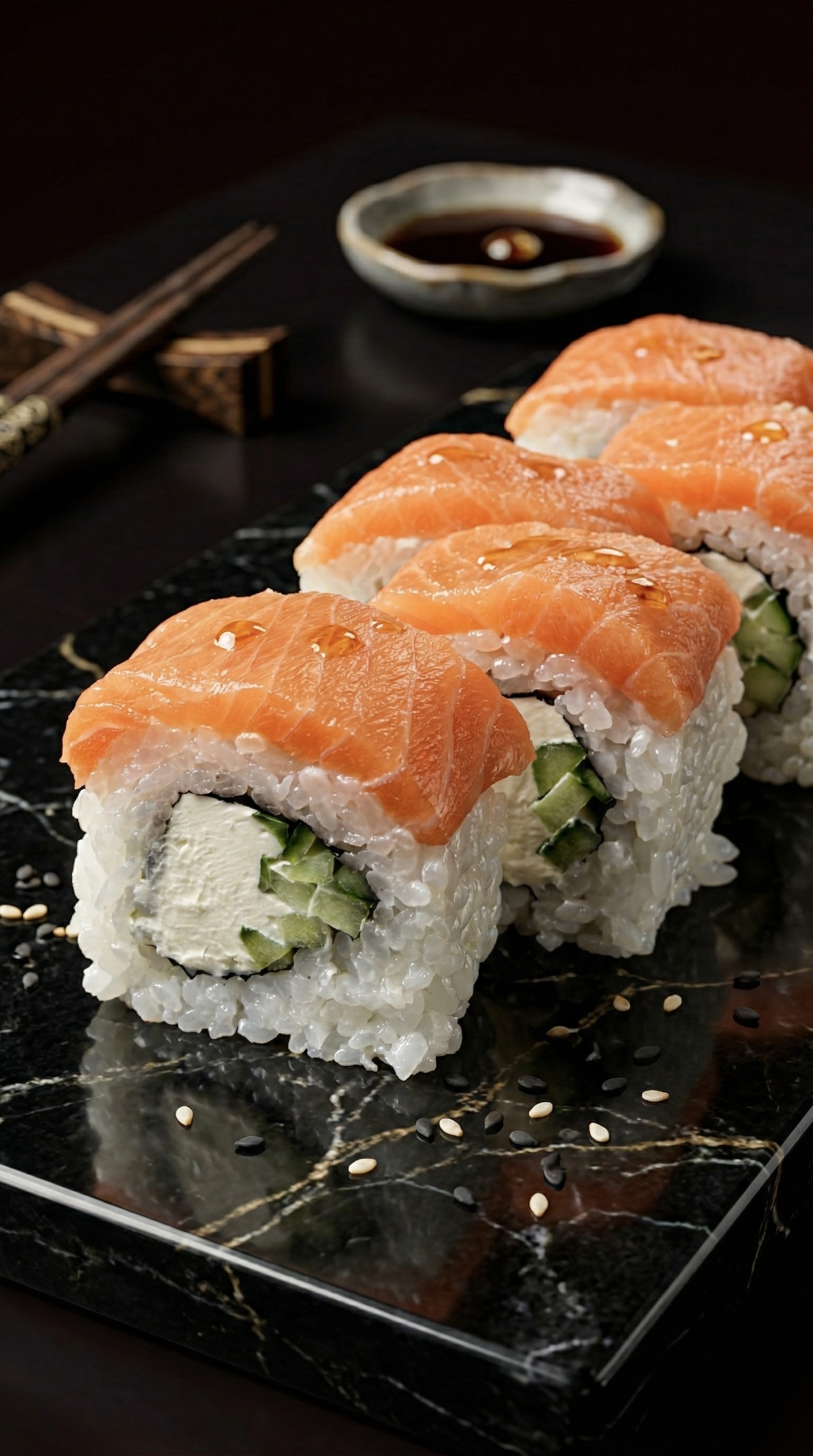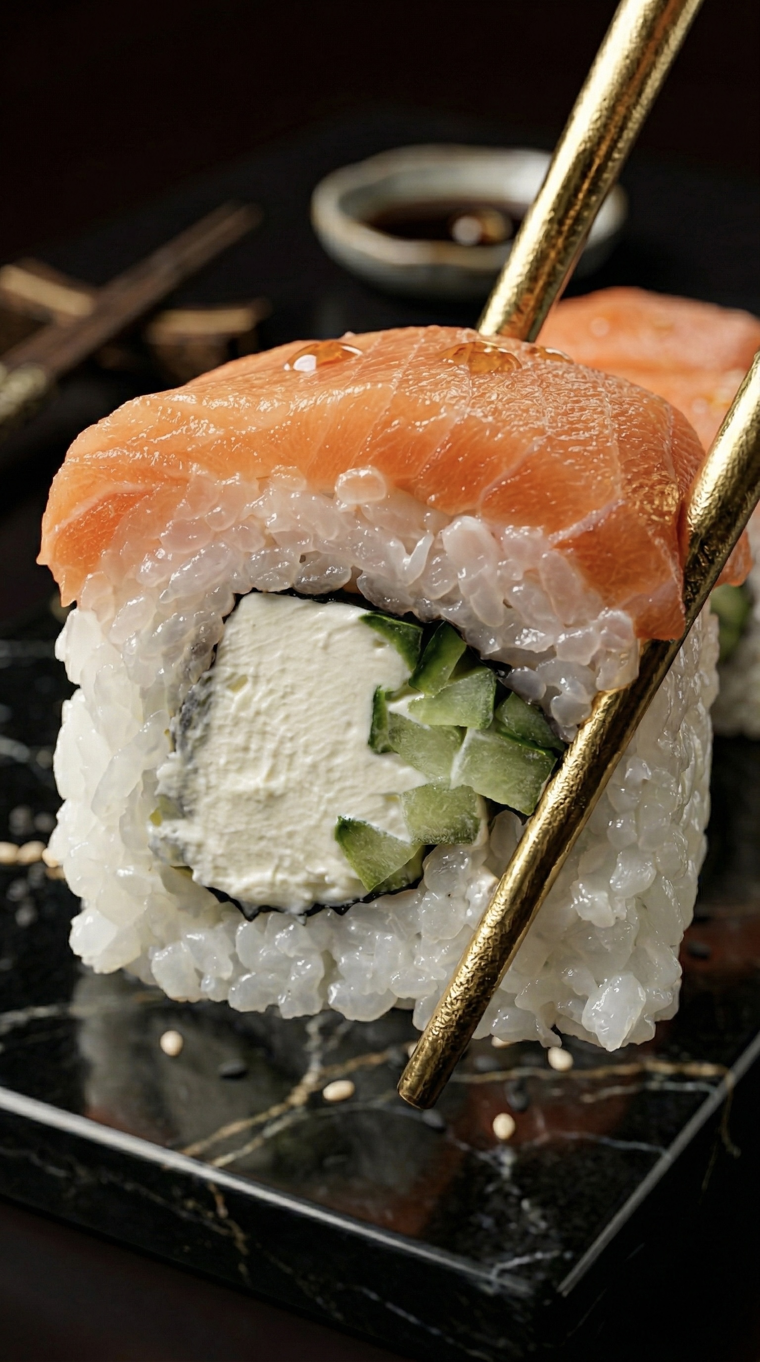 Роскошное сочетание нежного мяса камчатского краба и премиального лосося. Свежесть огурца и сливочного авокадо дополняется яркой сладостью спелого манго, а икра летучей рыбы добавляет изысканный хруст и морской акцент. Вкус, достойный особого случая