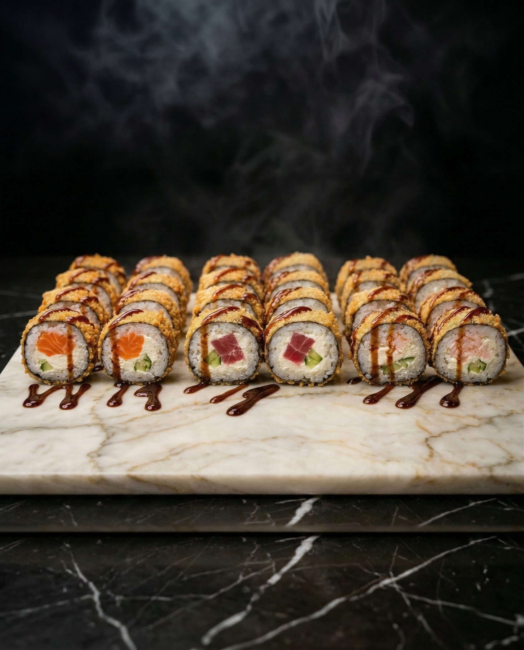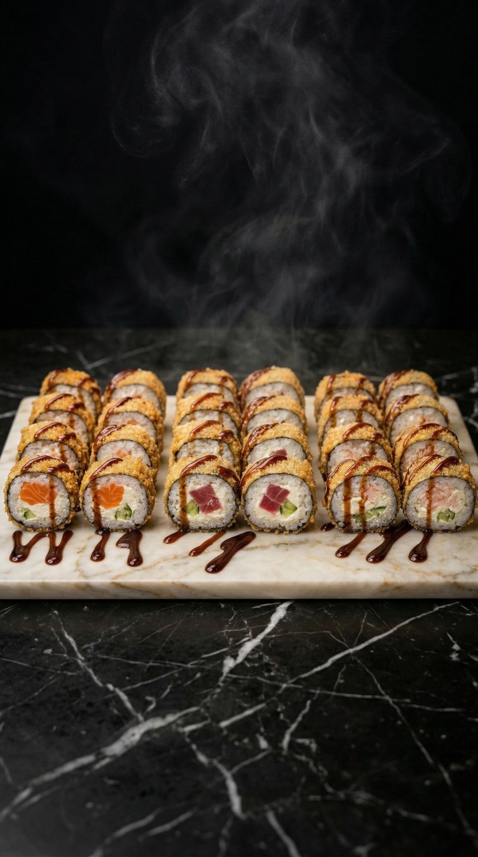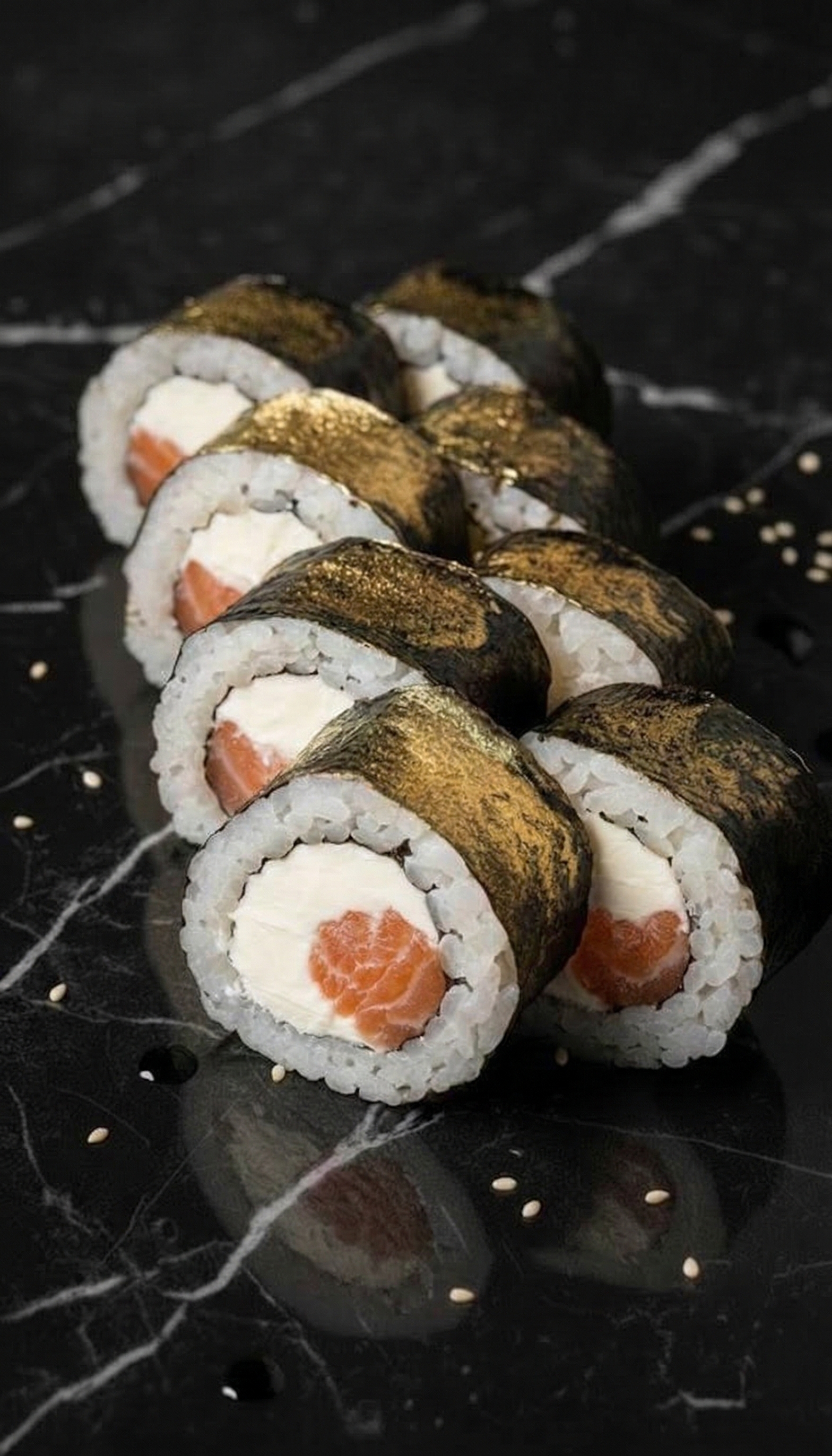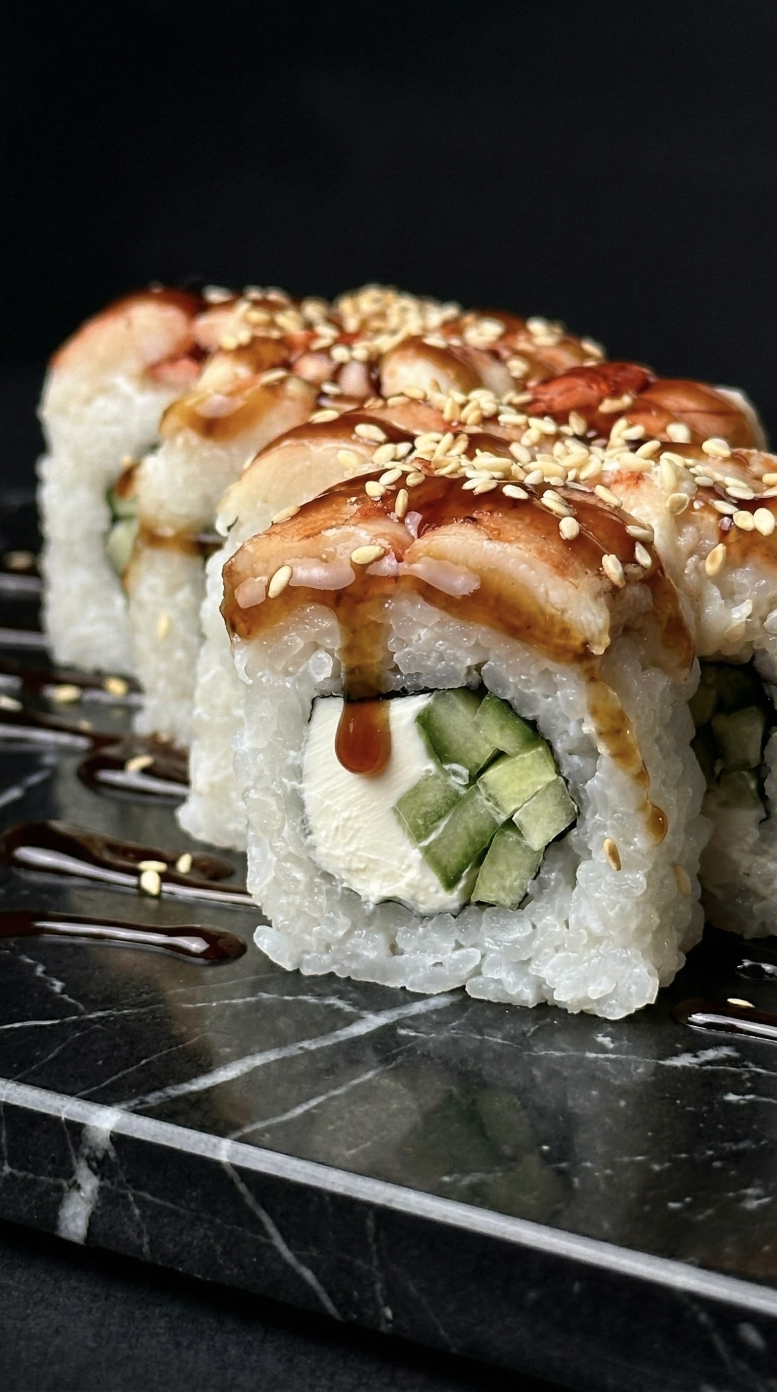 Гастрономическая роскошь в каждом кусочке. Нежный лосось и хрустящая тигровая креветка в объятиях сливочного сыра, дополненные свежестью авокадо и сладким тайским манго. Усыпано икрой масаго для идеального баланса