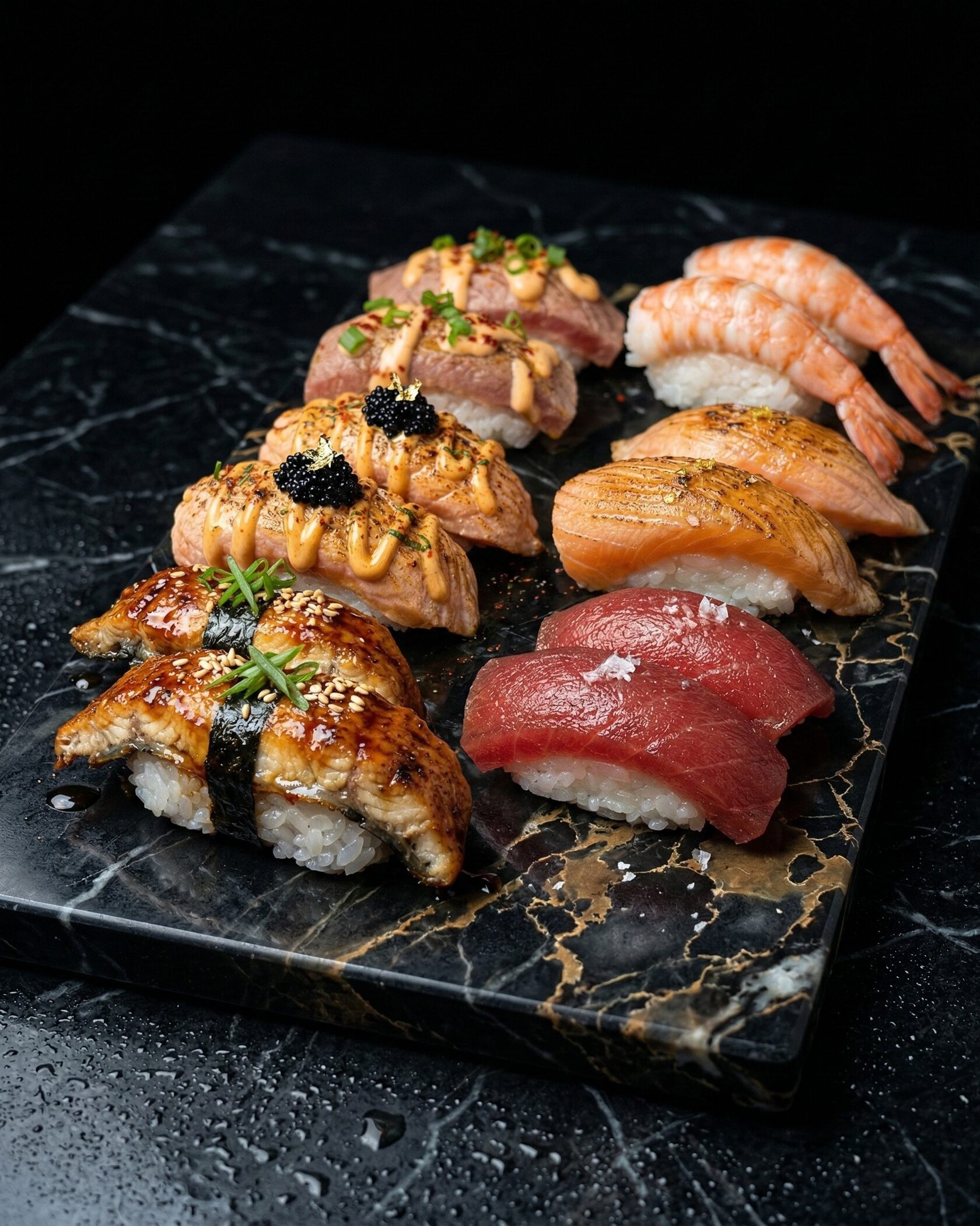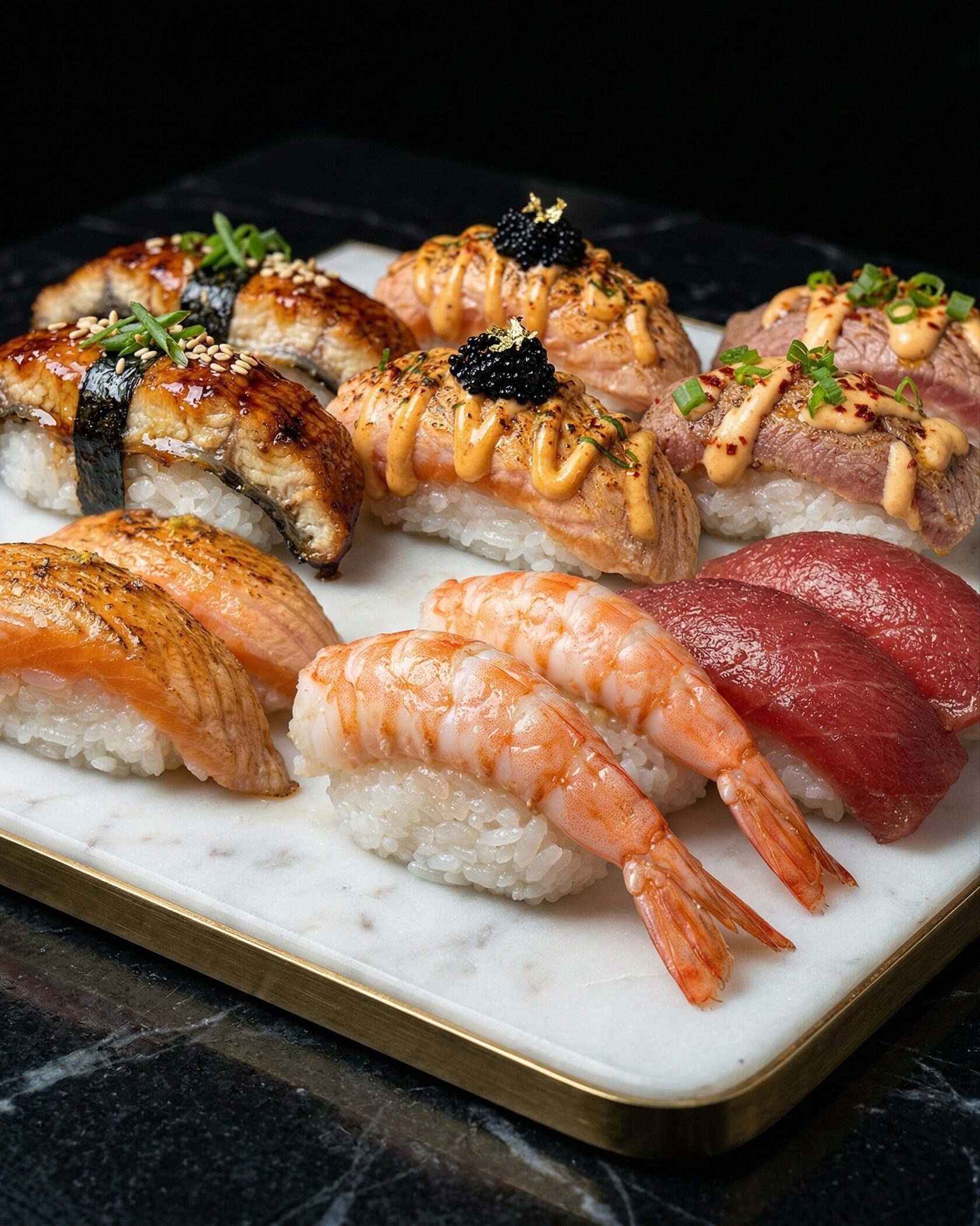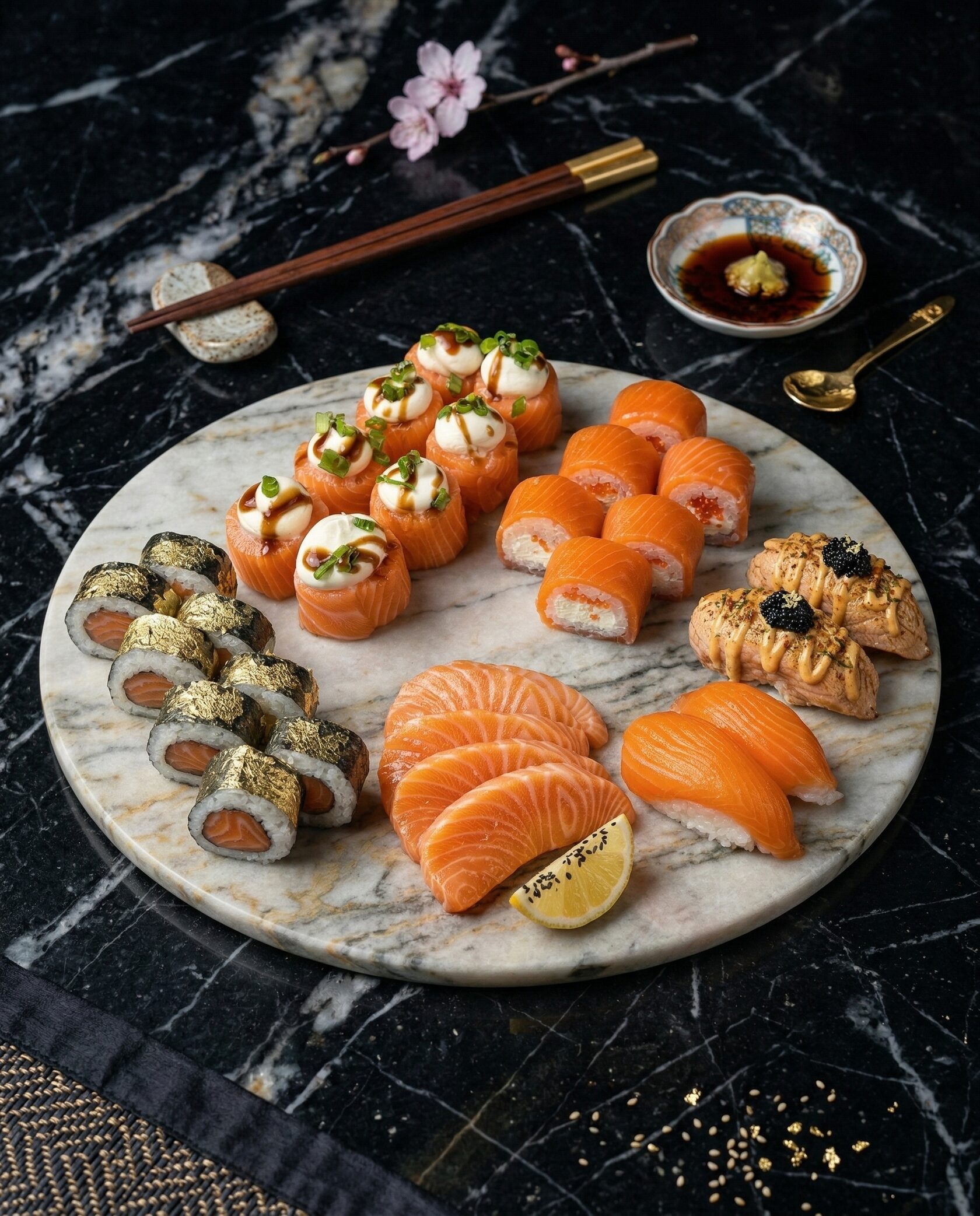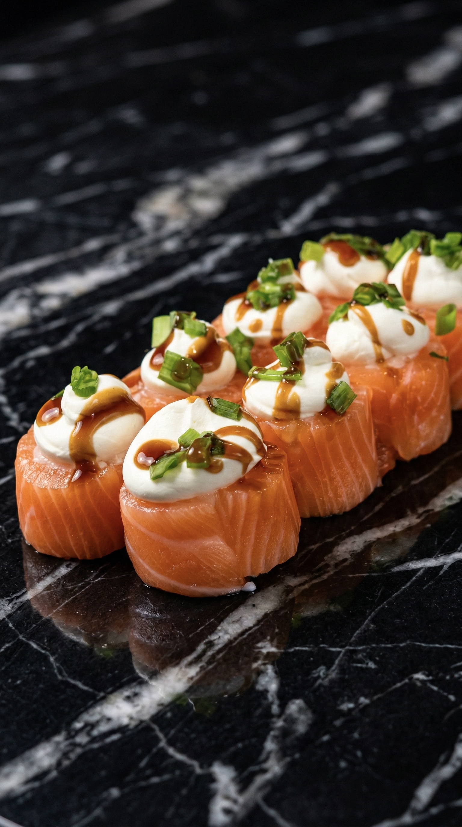 Гастрономическая роскошь в каждом кусочке. Нежный лосось и хрустящая тигровая креветка в объятиях сливочного сыра, дополненные свежестью авокадо и сладким тайским манго. Усыпано икрой масаго для идеального баланса